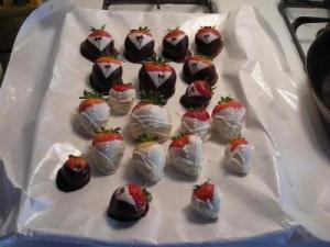 Here is a spectacular hors d'oeuvre for any fancy occasion. I took this picture at my friends wedding. My best friend's little sister Rachel made them! They are strawberries with milk chocolate and white chocolate coating (suiting).